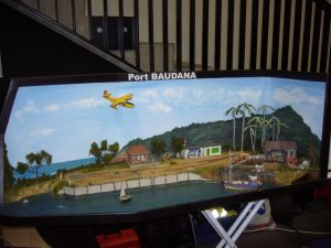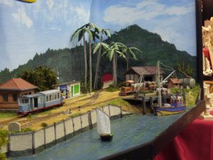 Cette année Michel nous propose un voyage lointain où il fait chaud toute l’année ; quelque part aux Antilles où il a découvert un charmant petit chemin de fer totalement imaginaire qu’il a reproduit sur une planche à repasser. Bucolique à souhait, il évoque une petite gare au pied des cocotiers à coté d’un minuscule port au bord de l’océan et qui incite aux rêves et farniente.